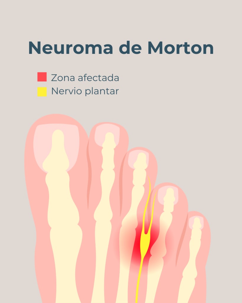 Este engrosamiento genera una compresión del nervio, lo que provoca dolor, ardor y hormigueo. Imagina tener un pequeño «nudo» en el nervio de tu pie.